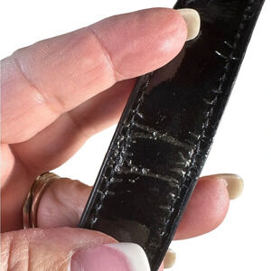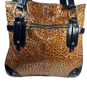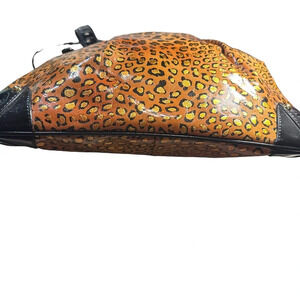 This “The Find” Animal Print Patent Leather Hobo/ Satchel Purse is in great vintage condition. The interior is stain and rip free. The handles have some creasing and potential peeling conducive with storage and material. This bag is roomy! The interior is lined with signature satin and features two reach-in pockets as well as one zippered pocket. Rare to find the signature gold keychain with these bags, but it’s there and it looks new! The exterior back has one large zippered pocket while the front has a large pocket under the gathered design, this pocket is the size of the purse!