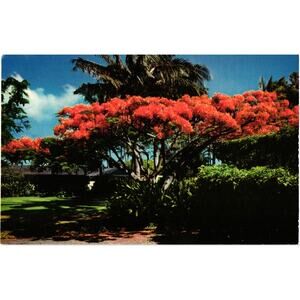 The Flame Tree is a vibrant symbol of nature's beauty, known for its striking, fiery red flowers that burst into full bloom, creating a stunning display of color. This postcard captures the majestic tree in full bloom, set against a clear blue sky or tropical backdrop.