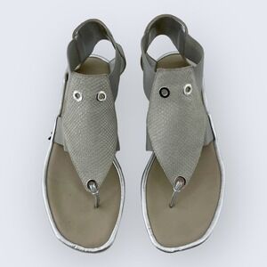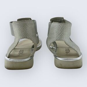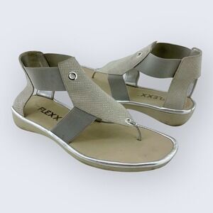 The Flexx Metallic Silver Elasticated Slip On Strappy Toe Post Thong Sandal. Size 6.5. Good used condition.