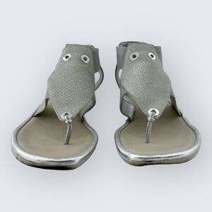 The Flexx Metallic Silver Grommet Elastic Slip On Strappy Toe Post Sandal 6.5