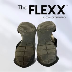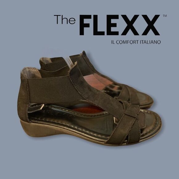 Cute! pair of The Flexx women's black, t-strap, black, suede leather sandals.