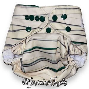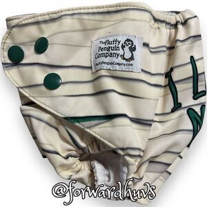 This is a fantastic reusable cloth diaper cover by The Fluffy Penguin Diaper Company which fits baby’s 10lbs - 40lbs or is better known as a one size fits all diaper. There are no inserts with this diaper cover but the cover alone is ADORABLE.