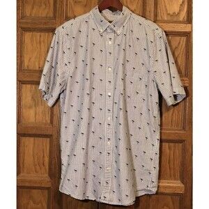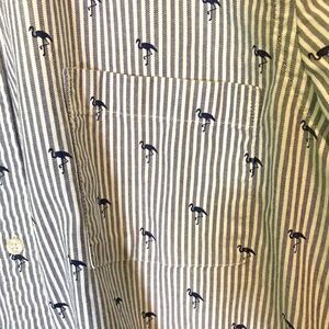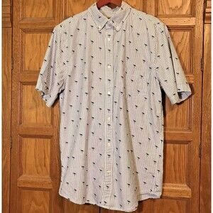 The Foundry Supply Co. Comfort Stretch Shirt. Men's size Large/Tall, White with Black Stripes and Flamingos, Button Up, Flamingo & Stripes Print, Button Down Collar, Short Sleeve Top with Pocket.