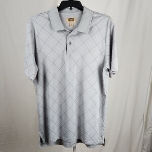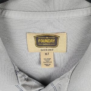 This gray polo shirt from The Foundry Supply Co. features a subtle geometric pattern, offering a stylish and modern look. Crafted from a performance material, it is perfect for casual or semi-casual occasions. The traditional collar and short sleeves add to its versatile appeal.