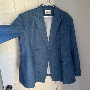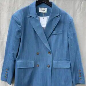 Stylish blue blazer with double-breasted oversized design. Features notched lapels and buttoned cuffs. Perfect for a chic look. never worn