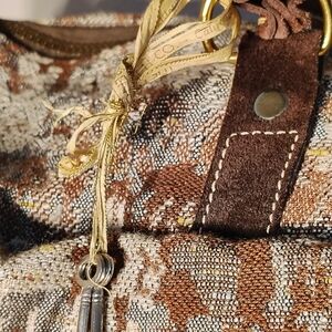 The French luggage company vintage travel totes / carry-ons/weekender includes the keys. item is in good condition with no roots or tears. The ribbon that holds the keys in place is damaged other than that everything is in working order. this is a rare pattern that I have not been able to find for sale anywhere else. it measures approximately 18 in x 8 in