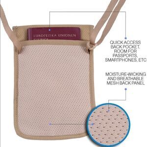 This travel bag is made of nylon and zips to close. The item itself weighs 1.5 ounces. This hides well under a T-shirt as you can see in photos.