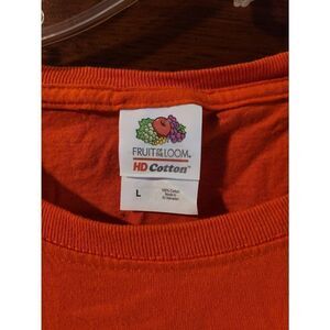 The Fruit of the Loom Halloween LARGE Halloween Orange Jack-O-Lantern Pumpkin Costume T-Shirt is an orange shirt with a jack-o'-lantern pumpkin design.