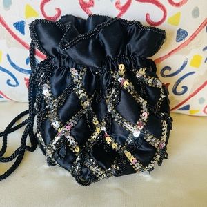 This gorgeous little bag is stunning. Perfect for all your essentials. Beautiful black and gold sequins. Draw string closure.