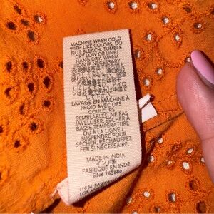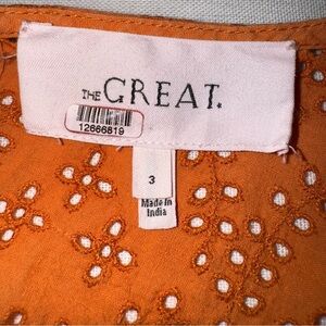 The GREAT. Eyelet Ruffle Blouse Top Orange 3/4 Sleeve Bohemian Boho Chic Size L