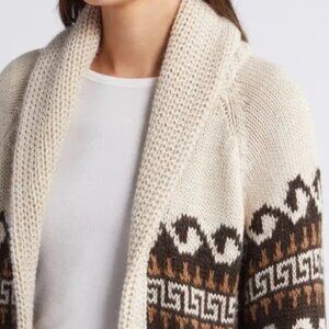 The LA label takes its typical Americana spirit way, way back in this ultracozy, wool-kissed cardigan featuring a jacquard-knit pattern inspired by ancient Greek emblems. Open front Shawl collar Long sleeves Ribbed cuffs and hem 50% alpaca, 45% Drytex® acrylic, 5% wool Dry clean Made in Peru