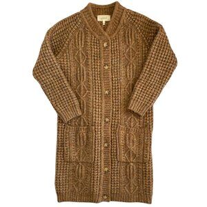 The GREAT. long cable cardigan is straight and long through the body with a beautiful fuzzy marled weave, front patch pockets, and slightly fluted neckline. Very nice condition. Beautiful neutral piece to wear over feminine dresses or blouses with jeans. Great wardrobe staple. Please see picture for more details and measurements. The GREAT. has its own sizing structure, so a Size 1 equals a Size Small.