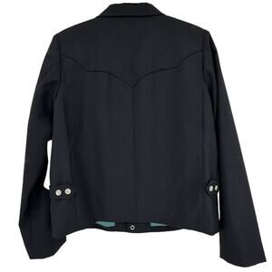 This navy blazer from The Great is a striking homage to Western wear. Its structured wool-poly blend fabric & bright satin lining make for a boxy fit with ornate yoking & seaming, a notch collar, back vents, & pearlized snaps. The adjustable side tabs ensure you get the perfect fit every time.