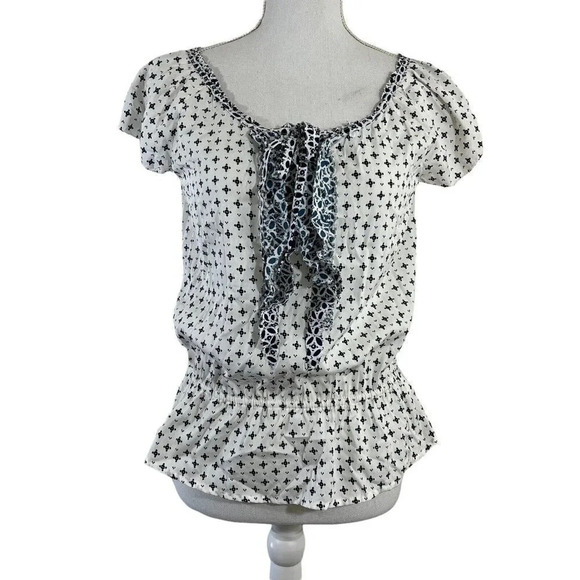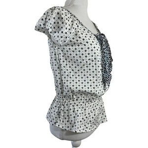 The Gap Small Ruffled Top Peplum Smocked Puff Short Sleeve White Blue Geometric White and Navy Blue