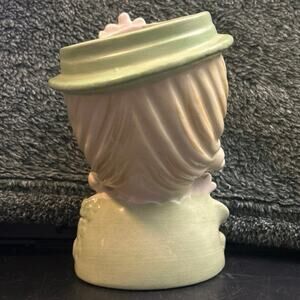Adorable and whimsical MCM head vase, made in Japan. This hand-painted ceramic vase features the lovely face of a young blonde girl with bright blue eyes, rosy cheeks and red lips, adorned with a lime colored hat decorated with flowers. The vase is further embellished with vibrant flowers and a black bow.