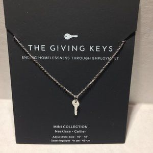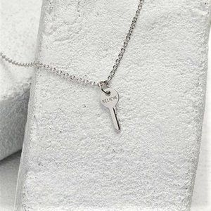 The Giving Keys Mini Key "Believe" Necklace in silver. It features a mini key (measuring .25” x .5”) with matching logo tag, a 16" chain with a 2" extender and lobster clasp closure. (Note item was removed from packaging to photograph).