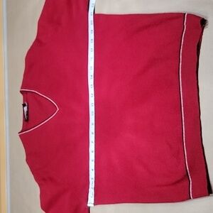 The Gleneagles Range Size Unknown Vintage Red Wool V Neck Sweater Blue & White Accents. Blue and White Strip Around Hems. Please refer to measurements in photos to ensure proper fit.