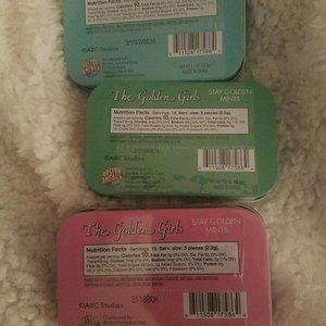 The Golden Girls Candy Mints Set of 3 Collectible Tins Blanche, Rose, Sophia. Each mint is shaped like a cheesecake.
