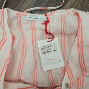 Fresh, lightweight, and perfect for spring/summer, this The Good Jane striped blouse features a flattering peplum silhouette, soft textured dobby fabric, and puff sleeves with adjustable ties. New with tag, but missing size — based on flat measurements, it fits like a Women’s Small.