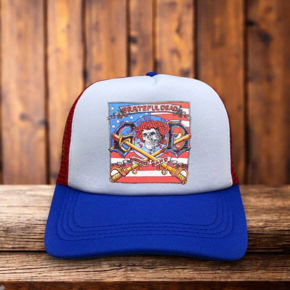 The Grateful Dead Mens Trucker Hat Blue Snapback American Flag Skull Retro Cap