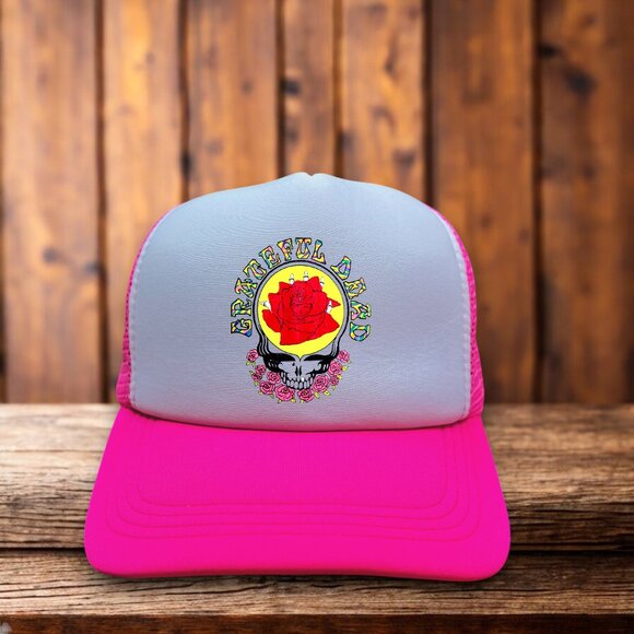 The Grateful Dead Mens Trucker Hat Pink Snapback Skull Roses Jerry Garcia Cap