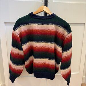 This beloved pullover is crafted in a soft wool yarn spun into a rich palette of painterly stripes. It is intended to fit slightly boxy and cropped, with exaggerated voluminous sleeves that taper into a fitted rib cuff.