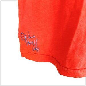 Pull on polo style shirt dress with collared button neckline and short sleeves. Small slits on the sides of hem. Embroidered logo on right side of hem. Ombre effect fading from lighter orange to deeper red orange. Cute logo with angel holding a spray can. China Wall is known for using distressed vintage items and making them their own, so please note there is intentional slight distressing and faded colorations to the dress as to be expected.