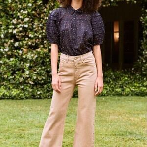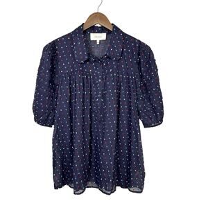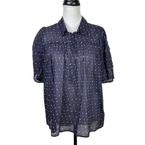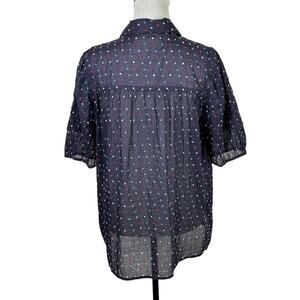 The Great. Mare Navy Blue Embroidered Dot Puff Sleeve Sheer 100% Cotton Blouse