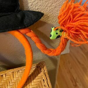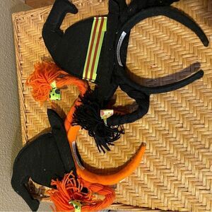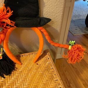 Stored in our Halloween stuff! Cool set of 2 pre teen adult goofy witch hats with black and orange braided pony tails that flip out on one side! Kind of like Pippy Longstocking?! Black and orange. Wore once during a parade! I’m not sure WHY I had the orange headband turned the wrong way in most of the pictures!! The both have the front stripe ribbon!