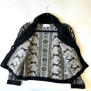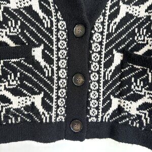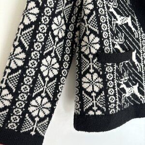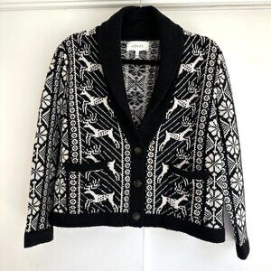 The Great. Folktale lodge reindeer cardigan has a cozy shawl collar, two patch pockets and front button closure. This winter knit is the perfect cold weather layer with the cutest reindeer and snowflake pattern. Women's size 0/XS/US 2.