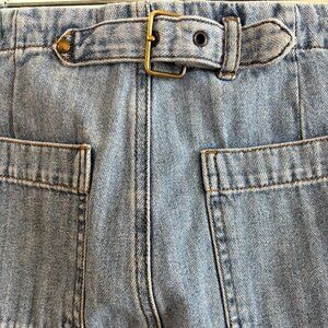 Seamed side pocket front with brass grommets. Patch pocket back with buckle detail.