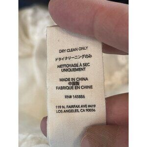 Pre-owned, good condition, a small faint dirt spot on the back of right shoulder, and a small pull/almost tear on the back of the left shoulder. Neither are noticeable when worn.