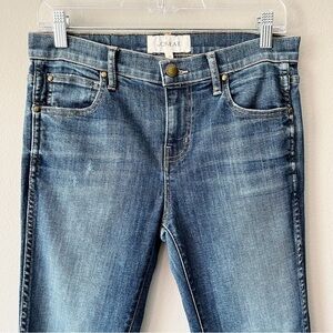 The Great. The Almost Skinny Jeans in medium blue wash. Factory distressing. Zipper fly with button closure. Functional pockets. Midrise. Pre-owned, excellent used condition- there is a small snag near back right pocket but no hole (see photos).