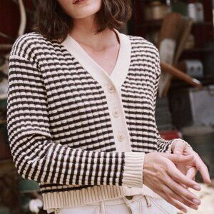 Uniquely textured thanks to horizontal stripes across a wide, vertical rib, The Mini Striped Cardigan. can be worn unbuttoned as layering piece or as a standalone sweater. It features a raglan sleeve, creamy contrast knit cuffs, and a corozo button closure. 60% Cotton, 40% Acrylic. Pit to pit: 22 inches; length: 21 inches. Size 2 is equivalent to a size medium. Excellent condition