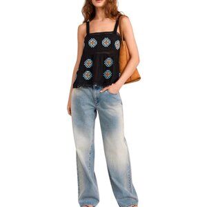 Keywords: boho tank, sleeveless top, summer blouse, The Great, embroidery design, cotton tank, casual wear, black top, lace trim, women's fashion, made in India, embroidered pattern, bohemian style, Cowgirl top, western top, boho top, folklore embroidery