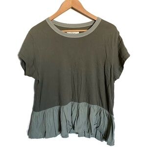 The Great. The Ruffle Tee Distressed Tee, Color Block Detail, Green Tee, Crew Neck with Ruffle Detail, Purposelessly distressed hems at neck and along sleeve edge. Size 2=Medium