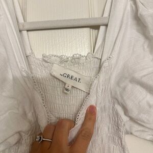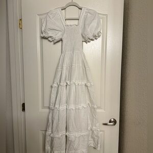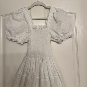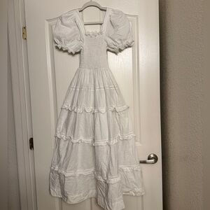 The Scallop Savanna Dress in White by The Great has an elasticized smocked bodice, voluminous to-the-elbow sleeve, and a flattering square neckline. Sweet scallop and eyelet panel detailing throughout the easy, tiered body makes this heirloom piece extra special. This dress is crafted in a slightly textured cotton and is lined for opacity.