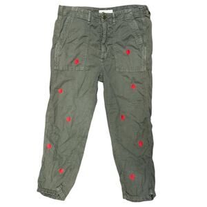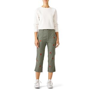 The Great. The Straight Leg Amy Pant – Green Embroidered Denim with Heart Appliqués – Size 27