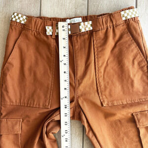 Specific/Style: Burnt orange color, attached belt, straight leg, ankle cropped, cotton/nylon/spandex