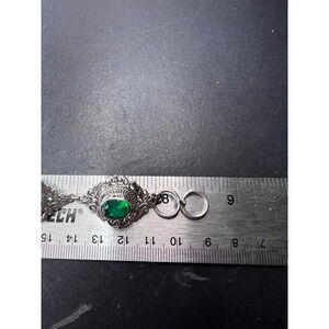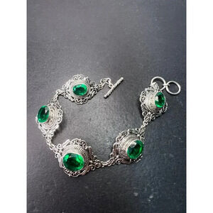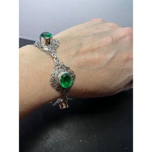These beautiful green gems test as quartz and under a loop you can see how color has been infused into the stones. It doesn’t make it any less magical though! A very beautiful and unique bracelet that stands out in every room , with every outfit. This is solid sterling silver with sturdy construction for this to last a lifetime. It’s built to last. No plating over the sterling so you’ll need to keep it sealed to prevent tarnishing. Look for a matching necklace. Sterling silver in Bali style. Weighs 34.38 grams. Measures about 8.5 inches in length. More ideal for an 7.5-8 inch wrist. Vintage