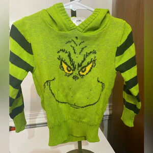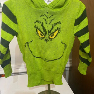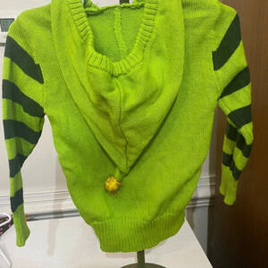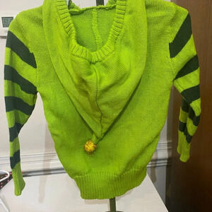 Green hooded Grinch sweater Size 18 months Green long sleeve sweater with Grinch face on front Hood with gold pom pom Smoke free home