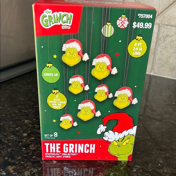 Set of 8 Grinch-themed lights. Features musical projection. Perfect for holiday decor.