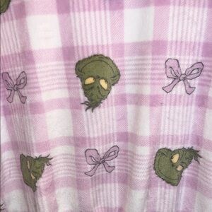 This ultra-soft Grinch fleece sweatshirt features a cute pink-and-white plaid print with Grinch faces and little bows throughout. Perfect for Christmas lounging, holiday parties, movie nights, or gifting!