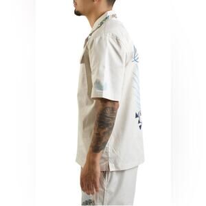 streetwear, coastal shirt, resort wear, embroidered shirt, men’s statement shirt, beach style, Grindhouse Denim, oversized fit, floral patch, designer streetwear, summer fashion, Riviera style, Beaulieu sur mer, short sleeve button down, vacation shirt