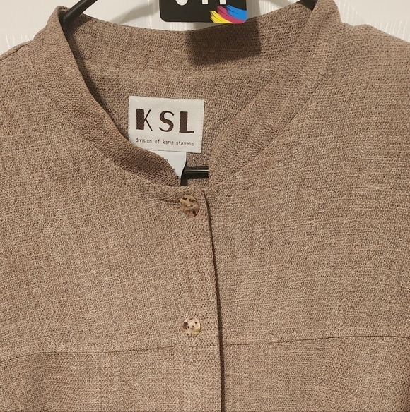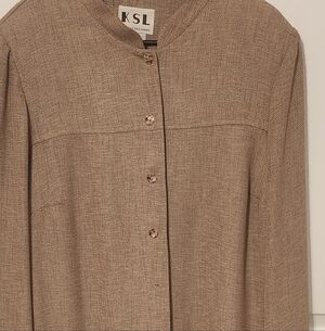 KSL ladies tan scoop neck long sleeve duster. six button front closure. One missing button.