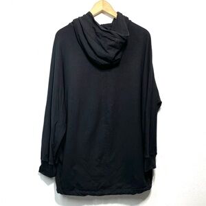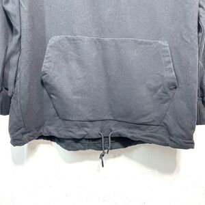 This is a relaxed, pull-on hoodie with a dolman sleeve, a kangaroo pocket and cinchable drawcords at both the hem and hood. It's made from soft, stretchy fleece fabric. **Drawstring is missing. Otherwise in great condition