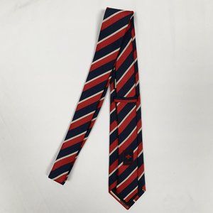 The Gucci Striped Pimentone Neck Tie in Midnight Blue and Red is crafted from a silk blend in Italy. This classic tie features a striped pattern with midnight blue, deep red, and white accents, and an embroidered bee emblem on the back.