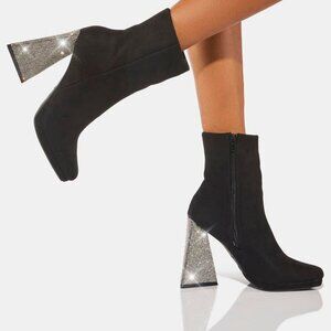 The Hot Spot Diamond Heeled Boots have a faux suede construction, rhinestone angled block heels, and side zip closures.