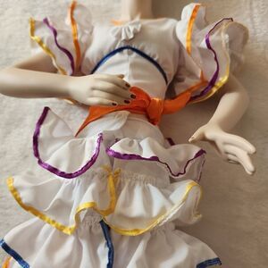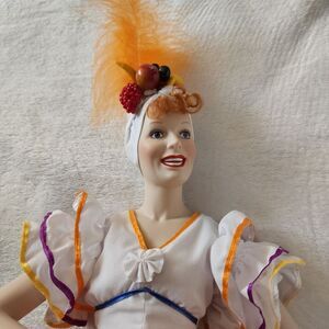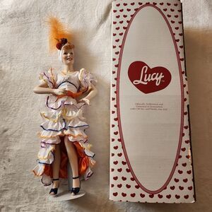 Vintage 1996 Porcelean Doll from I Love Lucy of The Hamilton Collection, numbered. Comes with Box and has been stored in glass case. stands aprx. 20" talk not including feathers. comes with stand. No chips, cracks