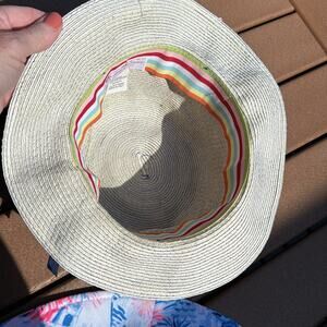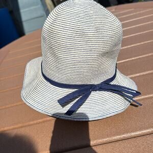 Stylish striped bucket hat featuring a navy ribbon accent. Perfect for sunny days.